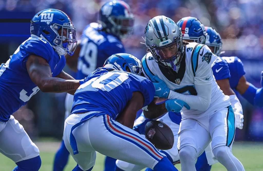 Carolina (0-2) had a chance to tie or go ahead, but a blitzing Julian Love sacked Carolina quarterback Baker Mayfield on third-and-5 to force a punt with 2:06 to play. The Giants were able to run out the clock, keyed by an 11-yard run by quarterback Daniel Jones on a third-and-2 that sealed the victory.