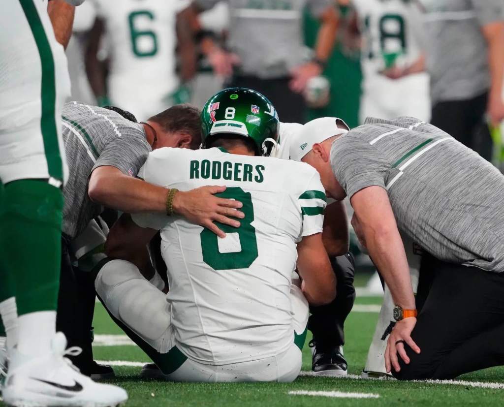 The New York Jets, even as their prized, four-time MVP offseason acquisition in Aaron Rodgers was knocked out of the game on the team’s first offensive series, unseated the Buffalo Bills on Monday night in a come-from-behind victory, 22-16.