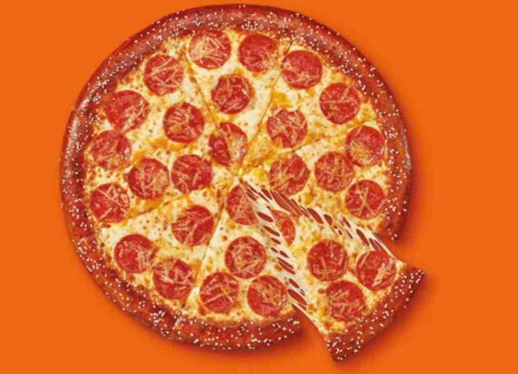 First introduced in 2014, the Pretzel Crust Pizza is a large buttery-flavored soft pretzel crust pizza with creamy cheddar cheese sauce, mozzarella and Muenster cheeses and pepperoni.