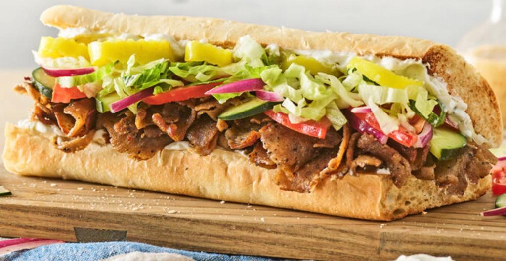The Big Fat Greek Sub features certified halal, seasoned gyro meat with tzatziki sauce with refreshing ingredients including a blend of marinated tomatoes, cucumbers, and red onions, which is topped with lettuce and banana peppers served on your choice of artisan bread.