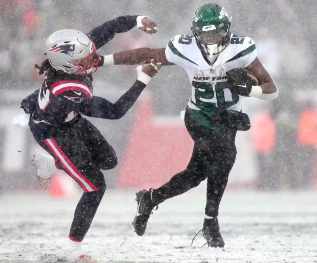 With snow covering the field and flurries swirling throughout Gillette Stadium, Greg Zuerlein kicked three field goals to help the New York Jets (7-10) earn their first victory over the New England Patriots since an overtime win on Dec. 27, 2015.