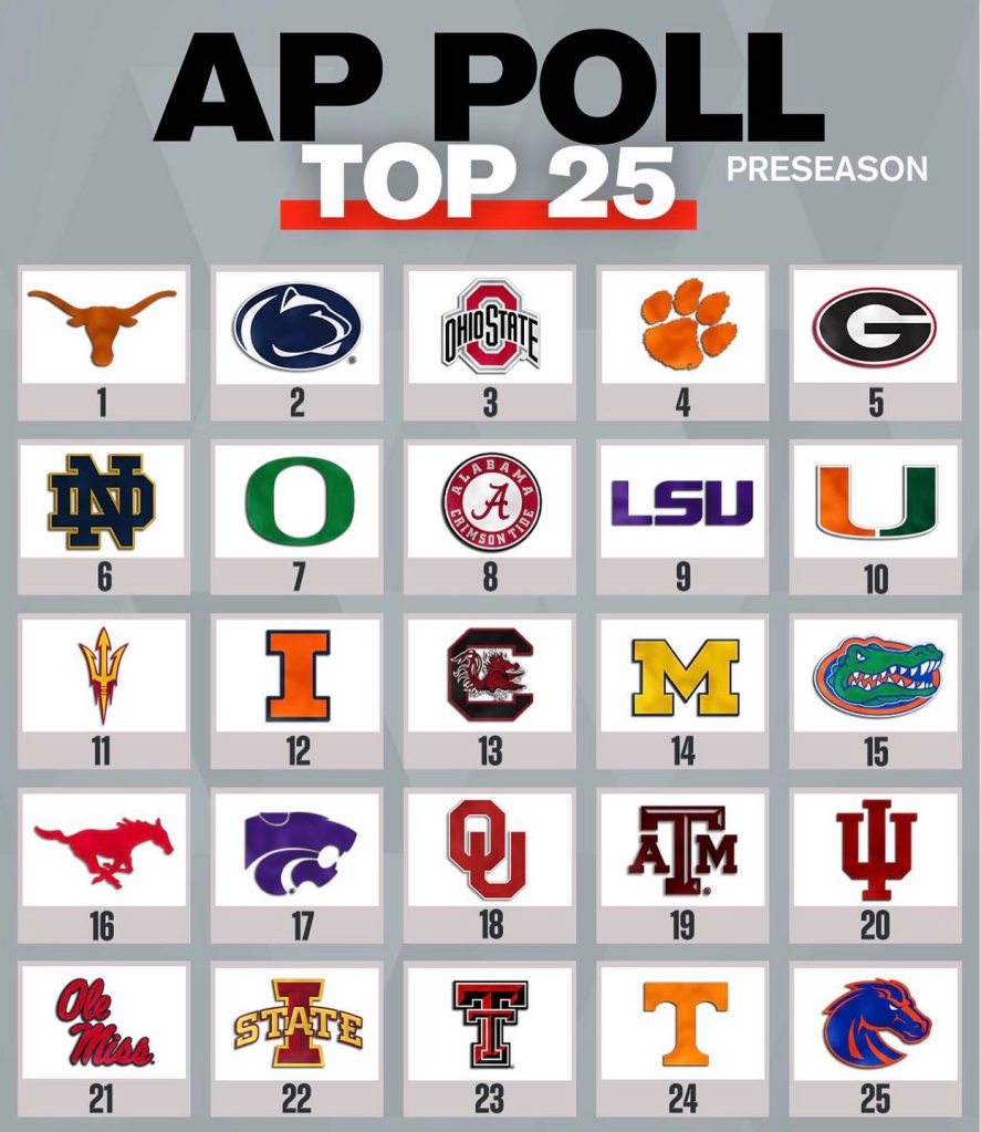 The Texas Longhorns will start the 2025 college football season as the No. 1 ranked team in the nation, according to the Associated Press’ Preseason Top 25 College Football Poll.